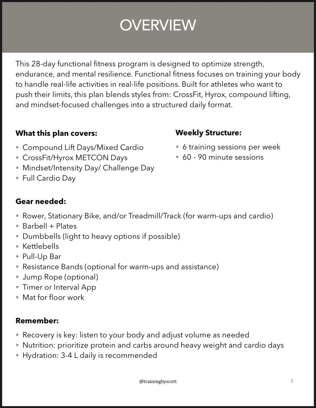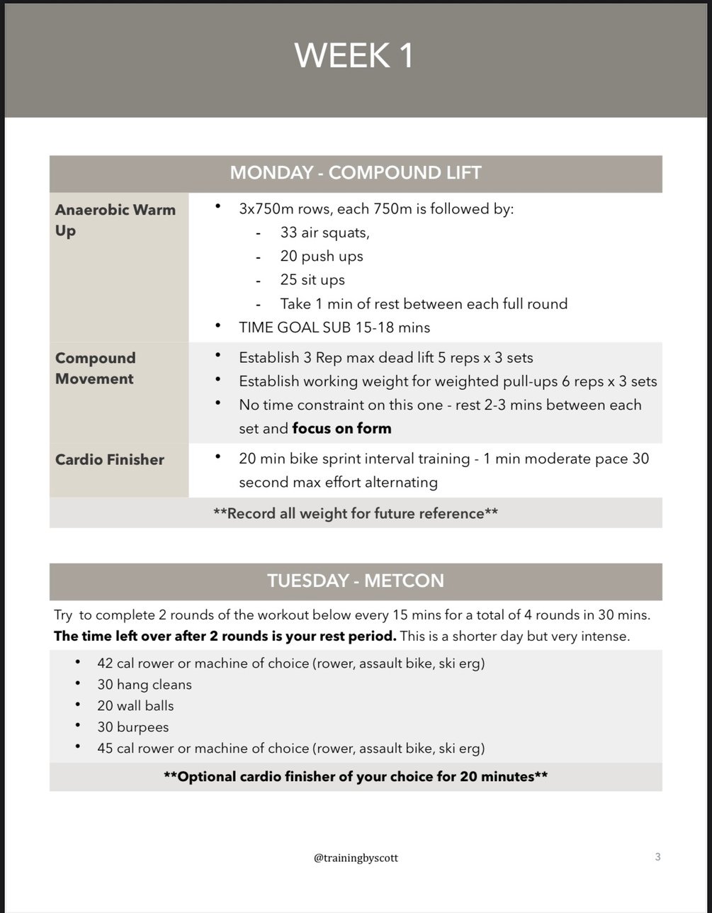 Hey! If you are here you likely understand how I workout, and my philosophy on functional fitness and training. This is a one month guide to building true muscular endurance and real world fitness, that has helped me in every capacity of my life. I really hope this program adds value to your fitness journey. Please reach out to me with any questions about the program or movements.